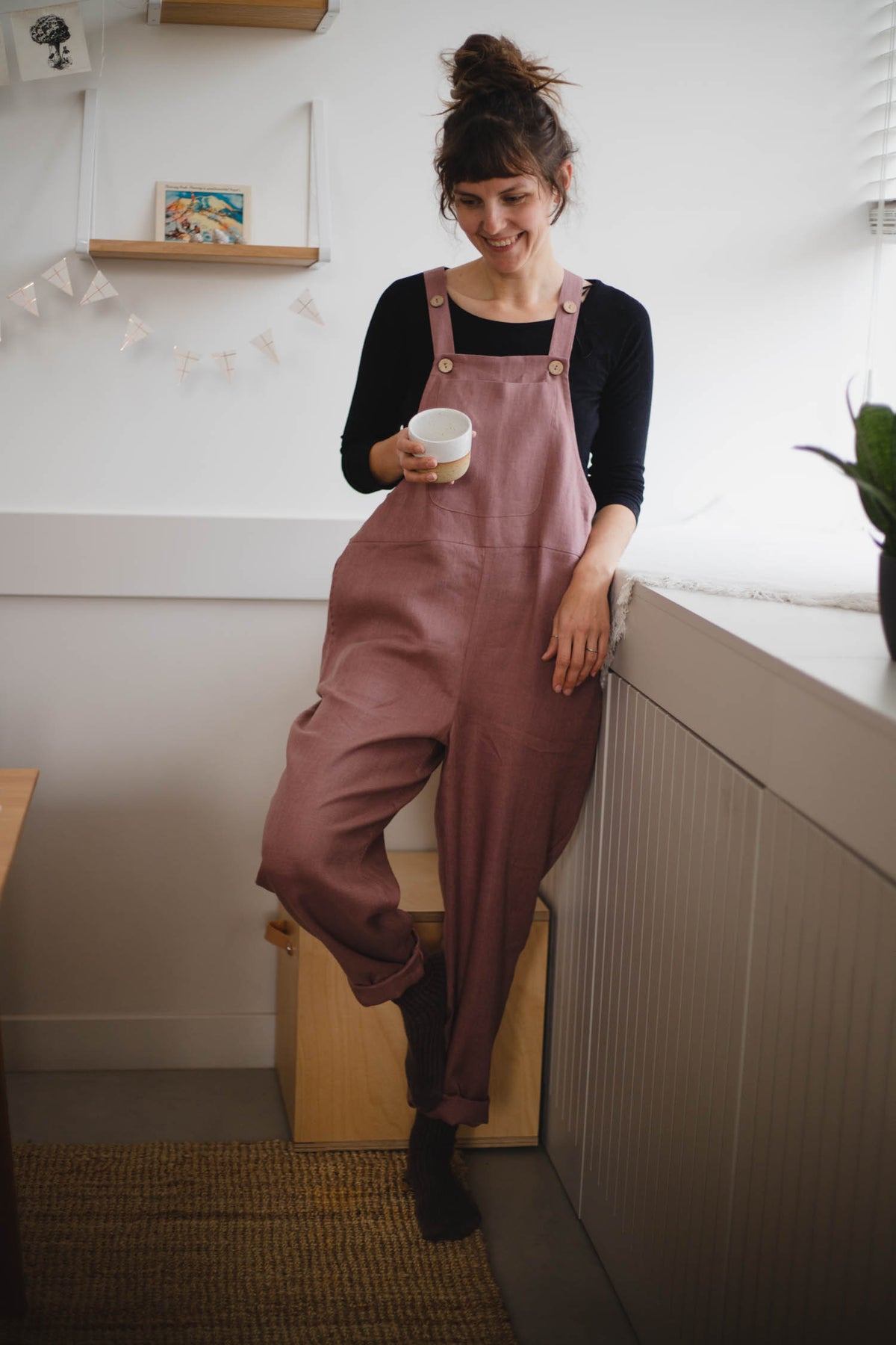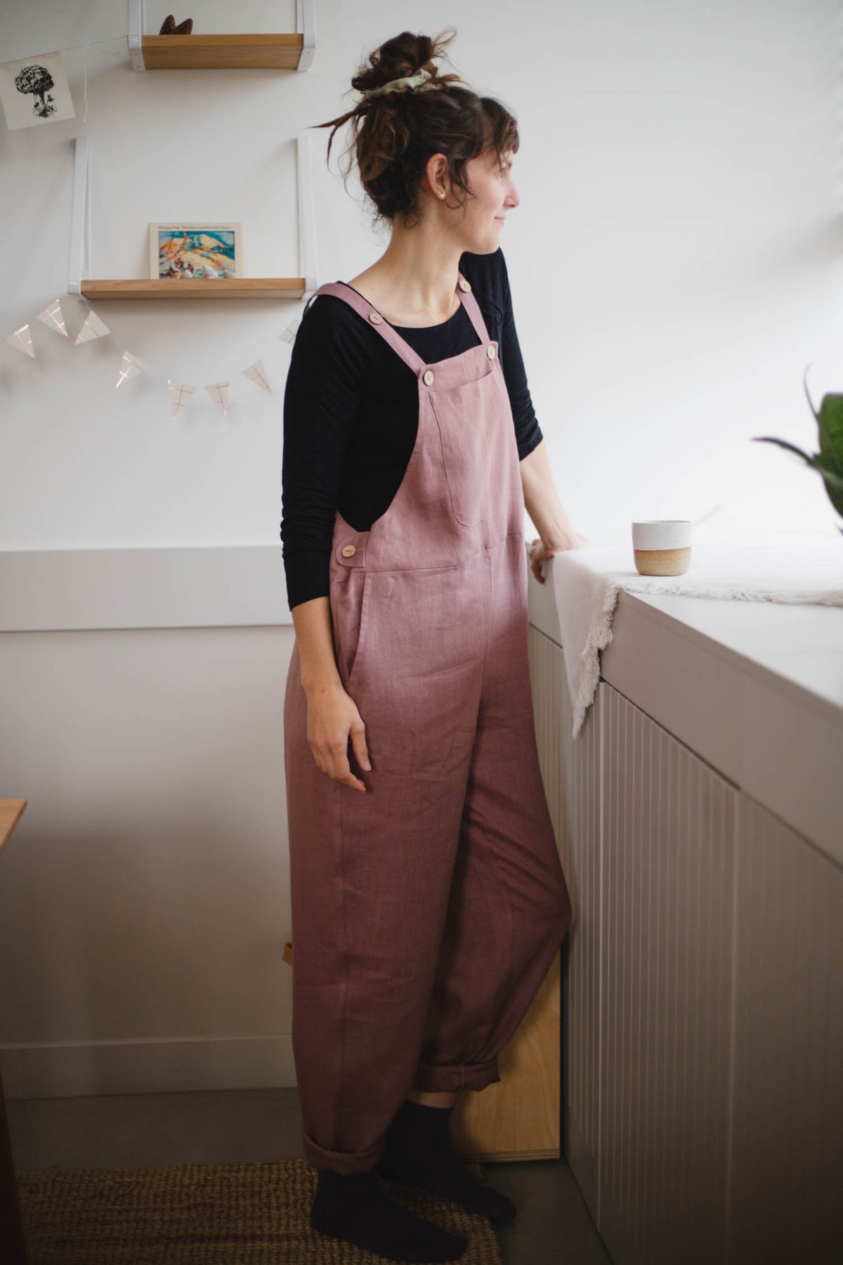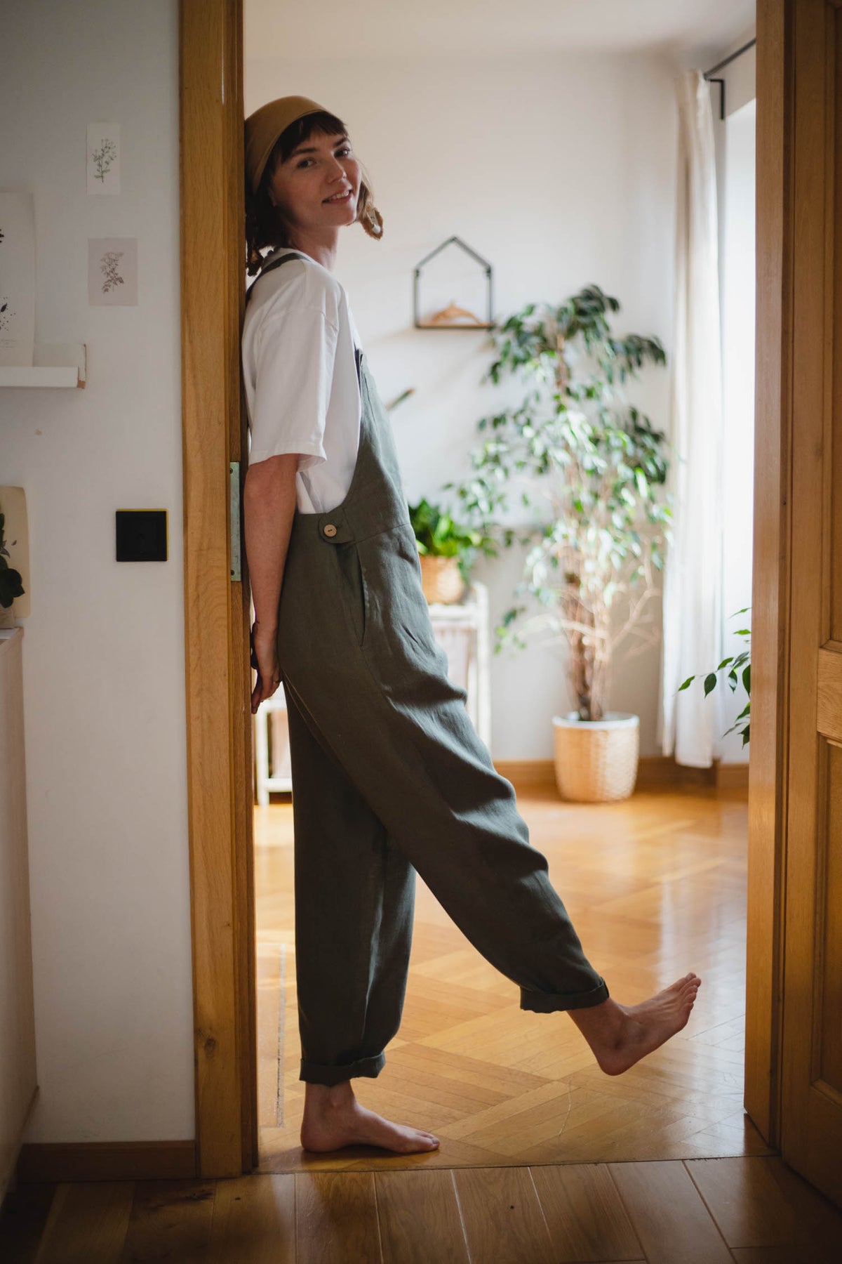 Łącz nasze lniane ogrodniczki damskie z topem, longsleevem czy t-shirtem.
